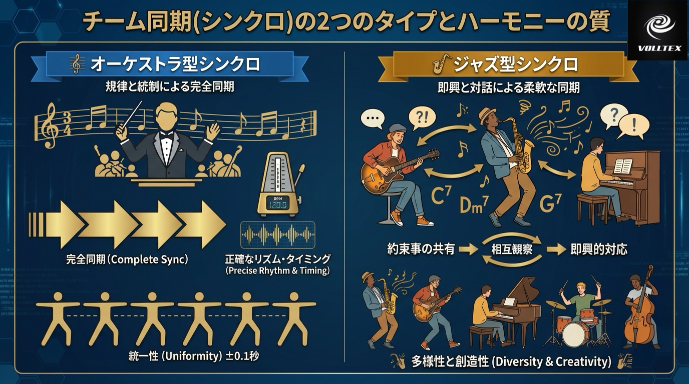 オーケストラのように、指揮者を筆頭に統率されたシンクロの中でハーモニーを奏でるのか、ある一定の約束事を決めた上で即興と自由を担保したジャズのようなスタイルのシンクロなのか。それは個人やチームのスタイルによって変貌するものであるとし、この記事を締め括りたいと思う。